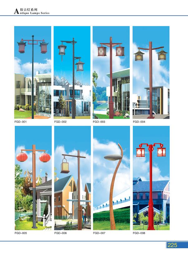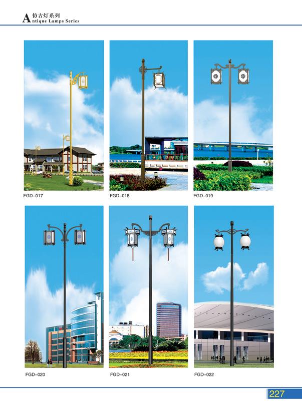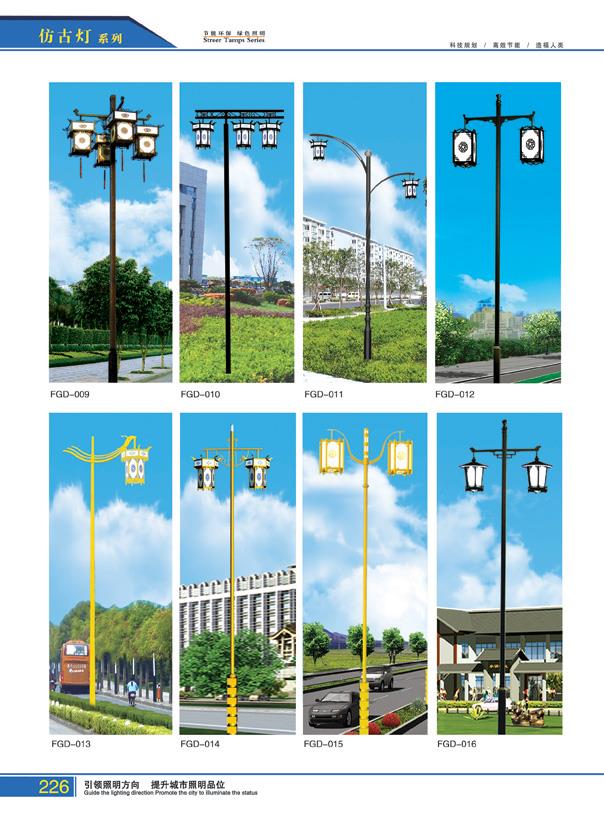 路灯照明系列,按造型分:中华灯、仿古灯、景观灯、单臂路灯,双臂路灯。仿古灯,顾名思义,样式模仿中国古代照明灯的样式,有一种典雅的古典美。