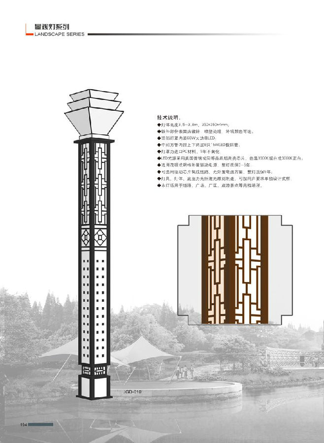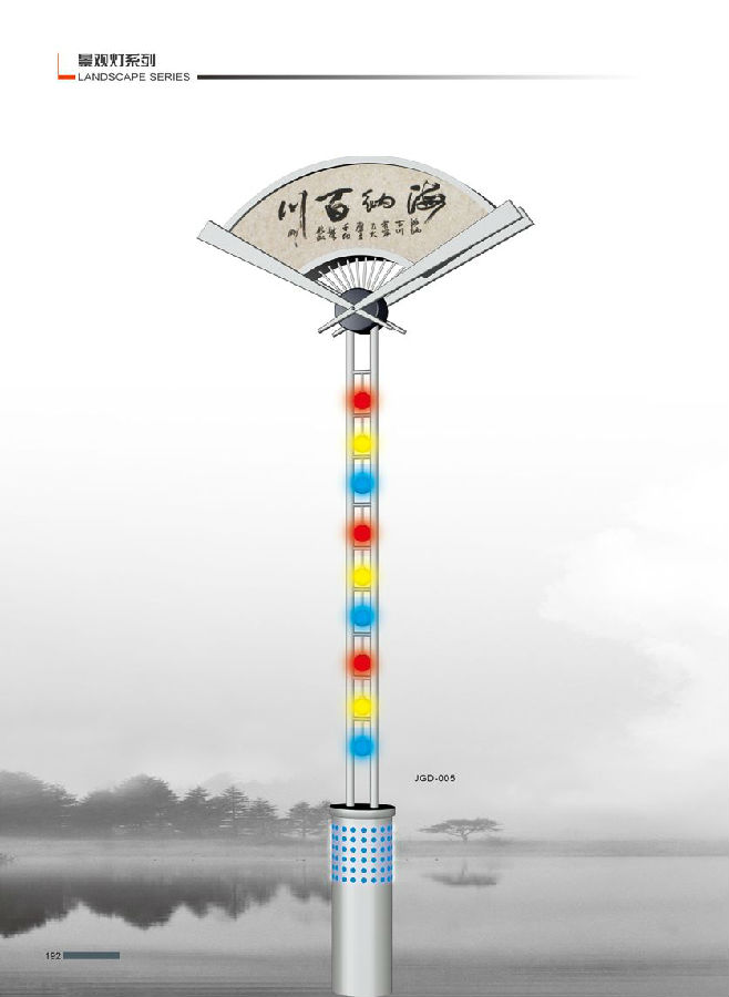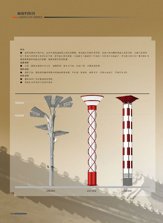 景观灯是现代景观中不可缺少的部分,它不仅自身具有较高的观赏性,还强调艺术灯的景观与景区历史文化、周围环境的协调统一.景观灯利用不同的造型、相异的光色与亮度来造景.例如红色光的灯笼造型景观灯为广场带来一片喜庆气氛,绿色椰树灯在池边立出一派热带风情.景观灯适用于广场、居住区、公共绿地等景观场所.使用中要注意不要过多过杂,以免喧宾夺主,使景观显得杂乱浮华.